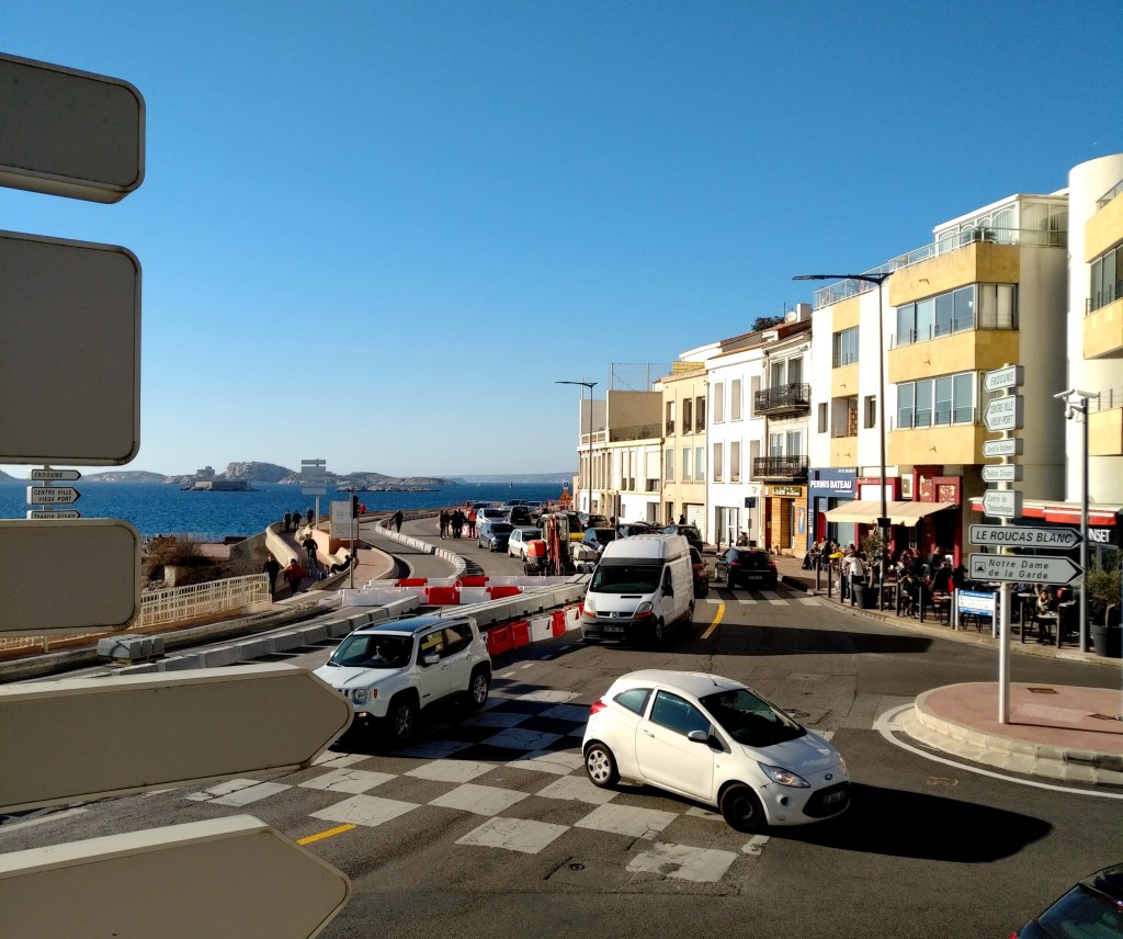 L’ouvrier en gilet fluorescent, casqué d’orange, son collègue, la brouette qui traîne, le petit train qui continue malgré les travaux. Circuit Panoramique Notre Dame de la Garde. Bleu, blanc, classique. Bus orange. HOP ON. En-dessous : MARSEILLE O (le reste est caché par une publicité pour un opéra tiré de la célèbre pièce de Pagnol). Les ombres grises. La gueule de chien couché de l’île Maïre baignant dans sa brume huileuse et blanche, avec ce trait qui blesse la pupille, à la limite visible de la mer qui ne dit rien que quelques couleurs simples et clichées, victime d’un vent absent et d’un temps magnifique.