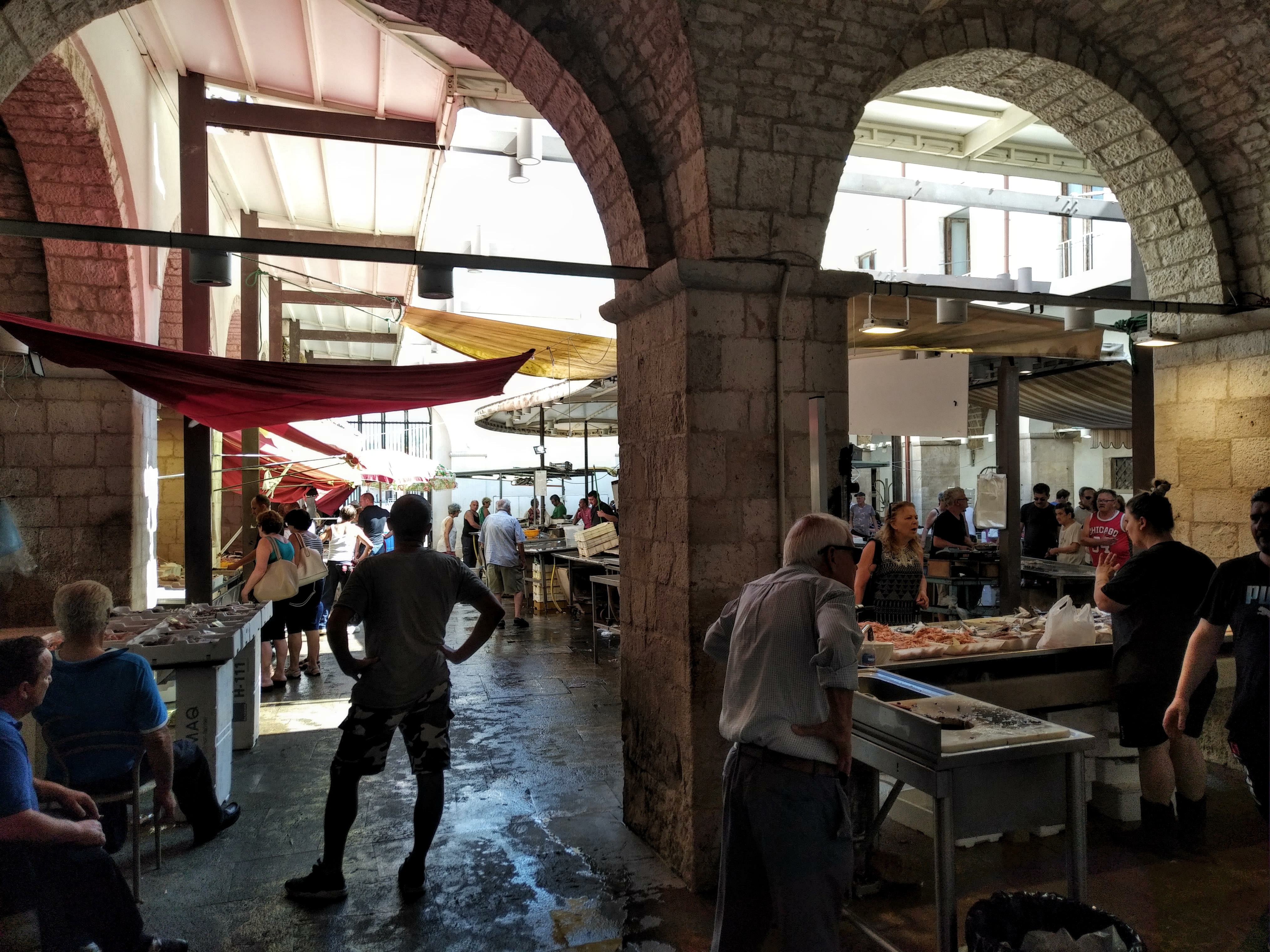 Le marché était avant le cloître d’un couvent, fondé en l’honneur de saint François, alors qu’il effectuait un pèlerinage entre Gardano et Bari. Un jour, il fit sortir de la bourse d’un religieux des serpents et jaillir la mer de l’arène du port. C’était au début du XIIIe siècle. Le soleil regarde toujours la cour carrée, ouverte en son centre, mais l’odeur des poissons a remplacé l’odeur de sainteté et les cris des pêcheurs le silence de la prière, tandis que les devantures vertes et rouges ne suffisent pas à protéger les bacs et les moules dans leur jolis sacs verts avec, à chaque commissure des mailles, de petites gouttes que rien ne décide à partir. Bretelles bleu nuit sur marcel gris. Bottes. Banane rouge sur le flanc. Des bras qu’on dirait du bois, fins et durs, à force de mer aussi bleue que le ciel. Il suffit que l’un d’entre eux crie, de ce chant universel, long dans la voyelle comme un psaume, et vienne buter à la fin sur le son d’un prix sec et précis, pour que le voisin s’y mette aussi, et pour qu’aux quatre coins du cloître les voix s’élèvent, heureuses et sans vraie concurrence. Le chiffre cinque ressort souvent. Rien ne semble cher.