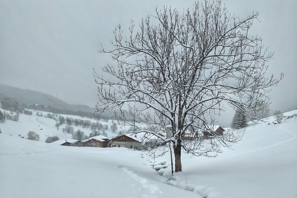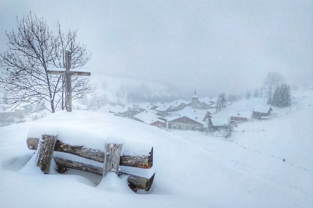 Je lâche ma gêne. Je les salue en m’excusant d’être aussi près d’eux alors que le paysage est terriblement égal partout, ici ou ailleurs, plus haut ou à peine plus bas. J’essaie encore le loup, cette fois-ci me croyant à l’abri sous une table qui doit être un autel, ou une carte pour s’orienter de l’œil et de l’esprit au cœur de la vallée tout droit, derrière le village, mais les flocons s’enfuient dans tout les sens, s’affairent, fondent ou durcissent, et tout, tout près de moi, finit par se tremper. « Vous avez plus de réseau ici ? » Je ne comprends pas ce qu’elle me dit. Ils s’en vont après quelques photos qu’elle juge nulles.