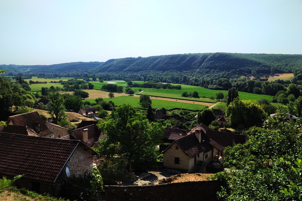 Si je me décide, bien assis sur mon muret, à reprendre cet escalier étroit qui finit par rejoindre l’à-pic de la falaise qui sert d’appui judicieux au château, ou plutôt si j’hésite, c’est parce qu’il regarde la vallée du Lot si verdoyante, si bord-de-fleuve, avec tout ce que cela signifie de richesse, de sève, de chlorophylle gonfle, riche à plus savoir qu’en faire, gorgée de teintes particulières pour chaque espèce, avec un vert pour chacune selon son inclinaison, aussi molle sans doute que les feuilles d’ici parce que le vent ne veut ni ici ni en bas je crois, mais que cette vallée frissonne sous un immense soleil général, chaud d’autant, blanc, parfait, partout, brûlant, mais tant pis, me voilà les cuisses coupées à cause de la position que j’avais sur le mur, et l’escalier souffre à chaque marche, je perds pourtant quelques années à mesure et me voilà là-haut ou presque et.