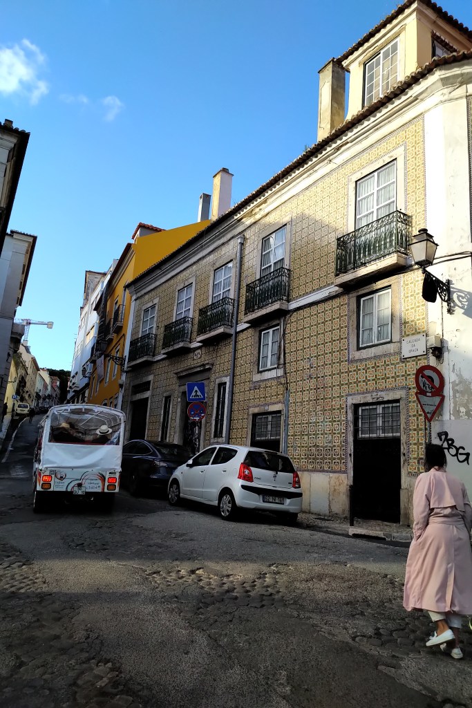 Je recommence à écrire alors que le soleil de faïence se fait moins tranchant et moins lisse sur les carreaux de la façade qui ouvre la CALÇADA DA GRAÇA, et que les ombres hésitent elles aussi, moins franches qu’à midi, à tirer leurs lignes droites sur les murs des maisons. Il est 18 heures 30 maintenant ; les gens se souviennent moins des morceaux de ville parcourus que le bas de leur corps fatigué ; je les vois, le soir descend déjà sur eux et les imprègne, imprègne leur démarche, leur pas, leurs pieds un peu gonflés dans leurs chaussures qui hésitent à monter ou descendre. Le ciel reste seul à ne pas vouloir encore se mettre au goût du soir, bleu toujours, bleu fidèle, d’un bleu qui rappelle que la mer n’est pas loin à l’embouchure du Tage, et si je disais qu’il s’assombrit je me tromperais peut-être encore pour quelques minutes. Alors j’admire tant que je peux l’équilibre parfait entre la sobriété des pierres qui encadrent les fenêtres et les portes et les motifs des céramiques peintes tandis que je redescends doucement la pente pour ne pas glisser sur le calcaire du trottoir.