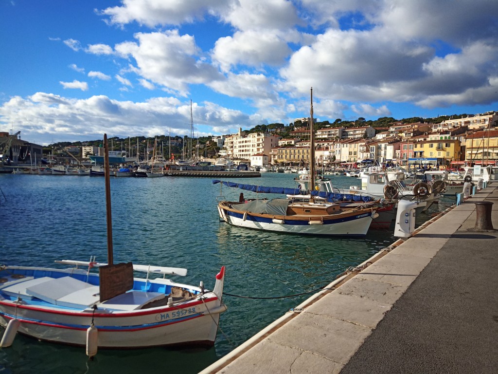 Cassis. Le petit port plein sud. Le soleil hiémal allonge les ombres des chaises et des silhouettes, tandis que sa lumière nargue celle du plein été avec six mois d’avance.