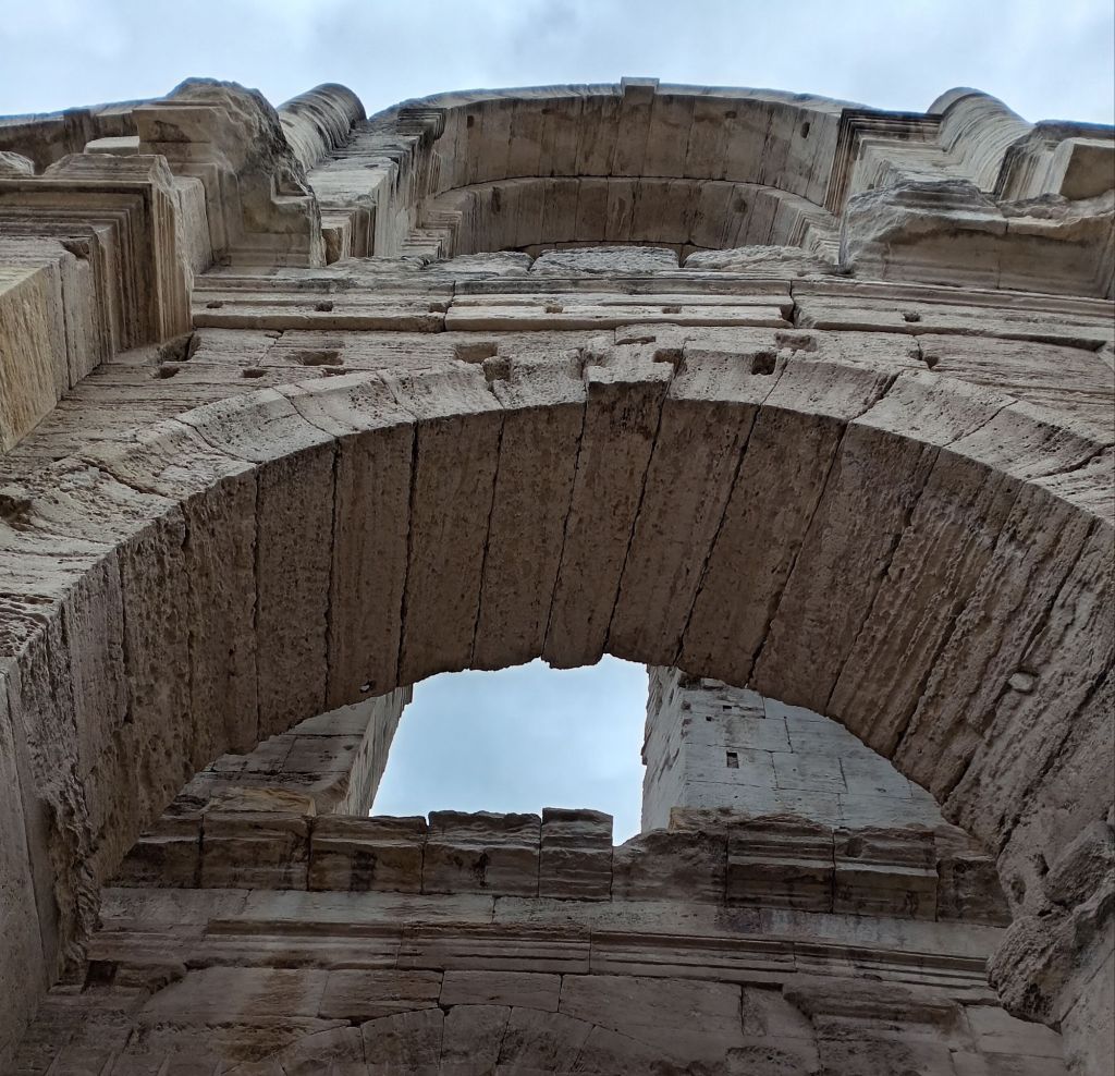 Je profite de la pause déjeuner pour aller cligner de l’œil de plaisir et de soleil devant la merveille de la ville. Le pied pressé, le souffle presque court, j’attrape un type au téléphone sur le pas d’une porte (« Et non ! Mais non ! Je te dis que non ! »), laissant un instant mes oreilles se concentrer, alors que j’hésite à courir dans les ruelles qui me séparent de ce que mes yeux veulent absolument aller renifler de plus près. Les voici, ces arènes, tout en calcaire couleur de lune, délice pour le regard, réponse multimillénaire pour l’âme affamée d’harmonie, application vitruvienne des trois principes célèbres, car malgré le temps et la pluie qui depuis si longtemps vient dissoudre la pierre en dissolvant le fer qui dort en elle, le monument est toujours là, utile et splendide, dressé comme une preuve inattaquable. Et même les gens semblent sonner moins fort aux terrasses justement installées devant l’amphithéâtre, peut-être parce qu’en ce moment précis, par-delà le cliquetis des couverts et des verres, des rires et des conversations sans doute tout à fait semblables à n’importe conversation sur cette terre qu’on aurait avec son voisin au moment du déjeuner, leur bouche et leurs yeux se retrouvent devant deux tables différentes.